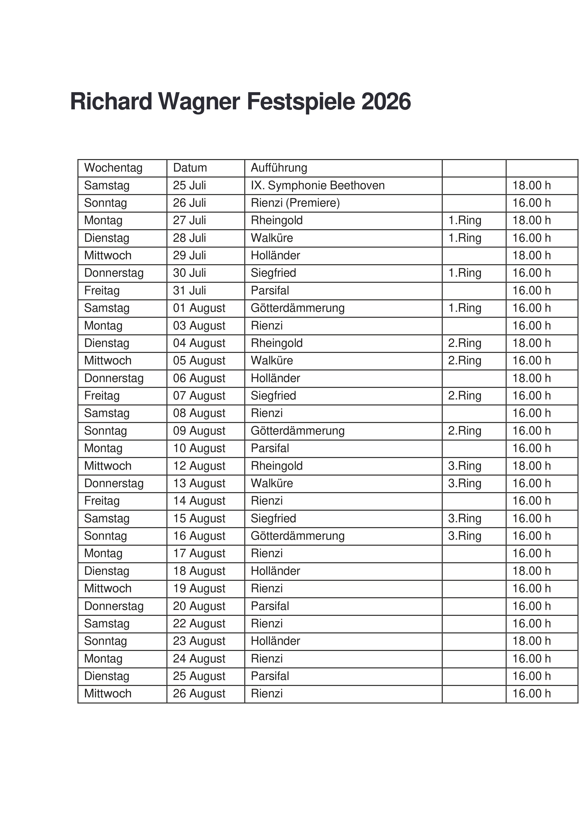| Wählen Sie hier Ihren Termin für die Wagner Festspiele 2025